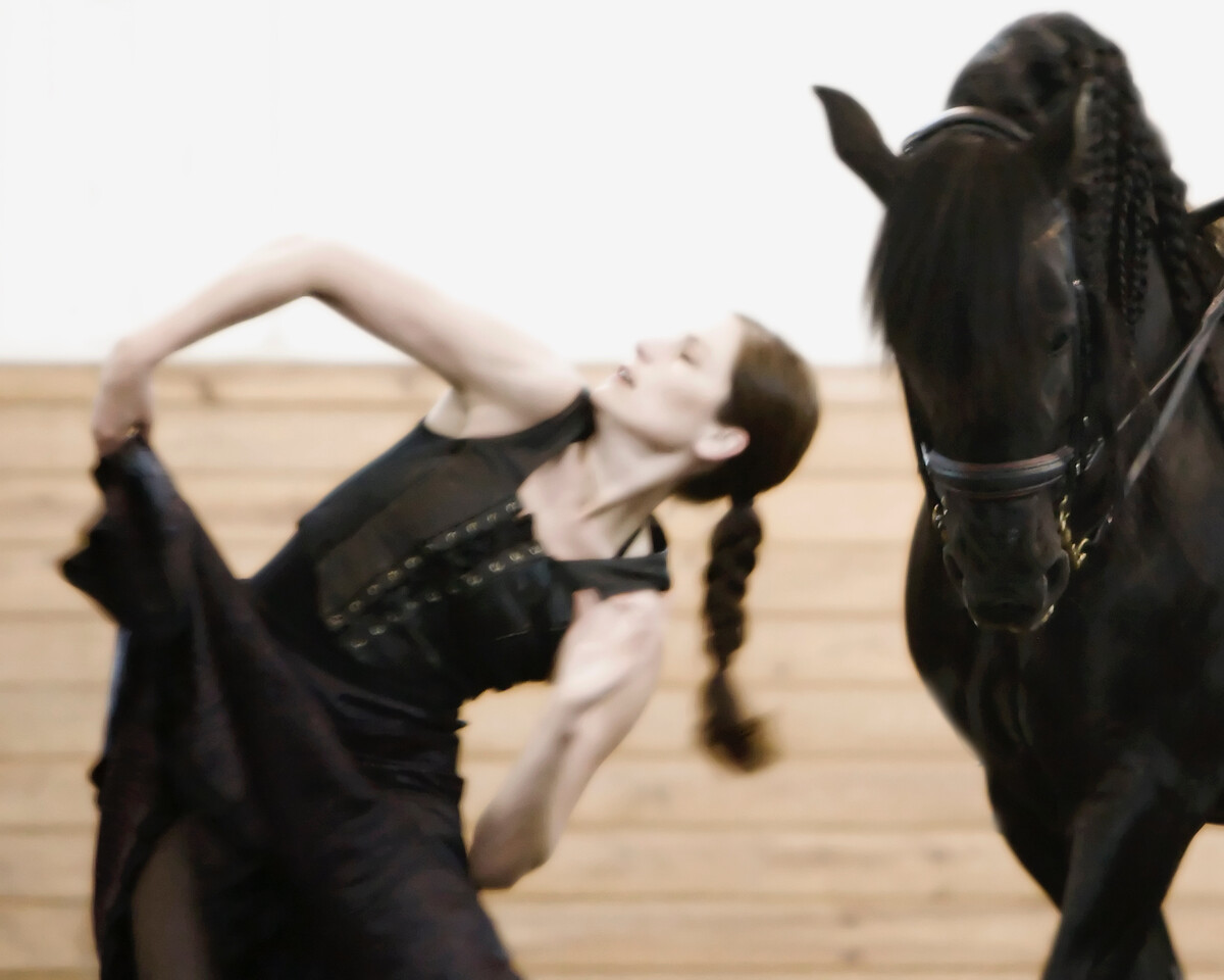 Black Friesian gelding, imported from Holland. Son of the approved Friesian stallion Brandus 345. He was the gentle giant and a collaborator in all of my EMBODIED EQUINE EXPERIENCING work. Sanne loved to help humans understand how to listen and connect, with extraordinary generosity, patience and kindness. Sanne was also a beautiful and generous performer, and has been in three of my dances with horses, FLIGHT, Scarlet, and Krump, with rider Brandi Rivera, and dancers Ingrid Schatz, DeAnna Pellecchia, Dillon Paul and Paola Styron. Paintings on this page by Pam White.
