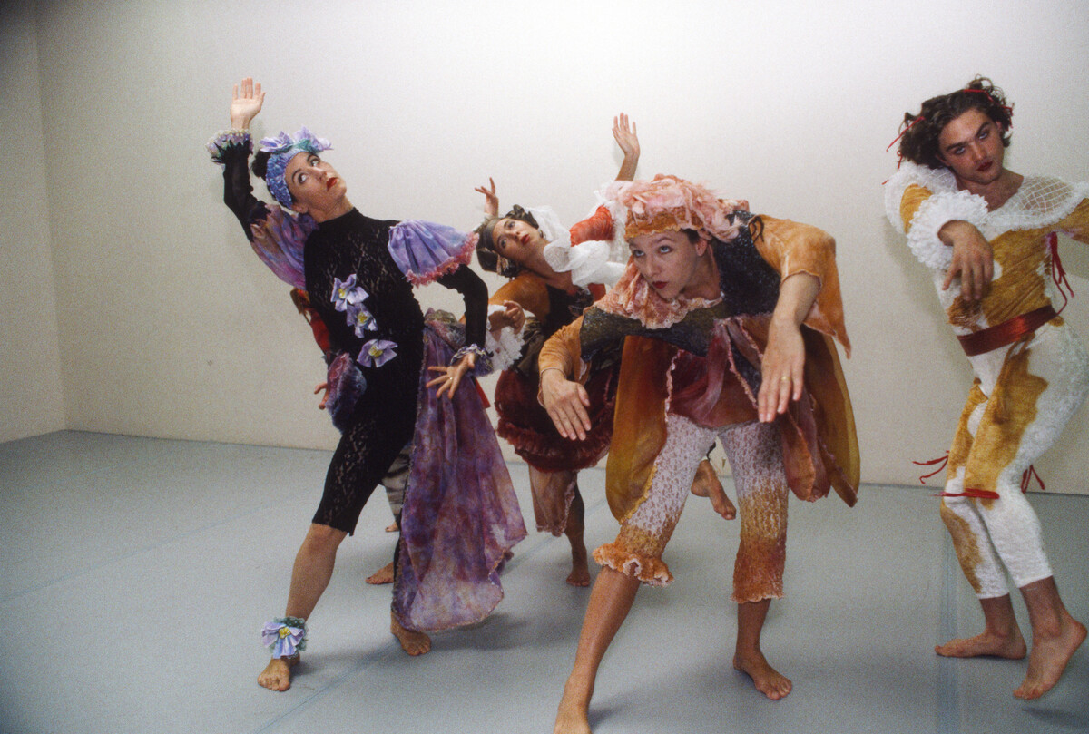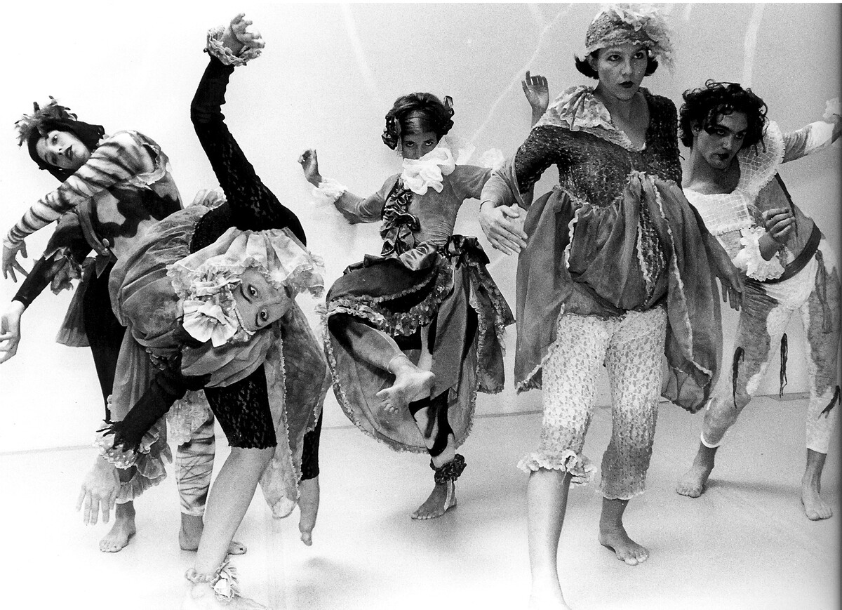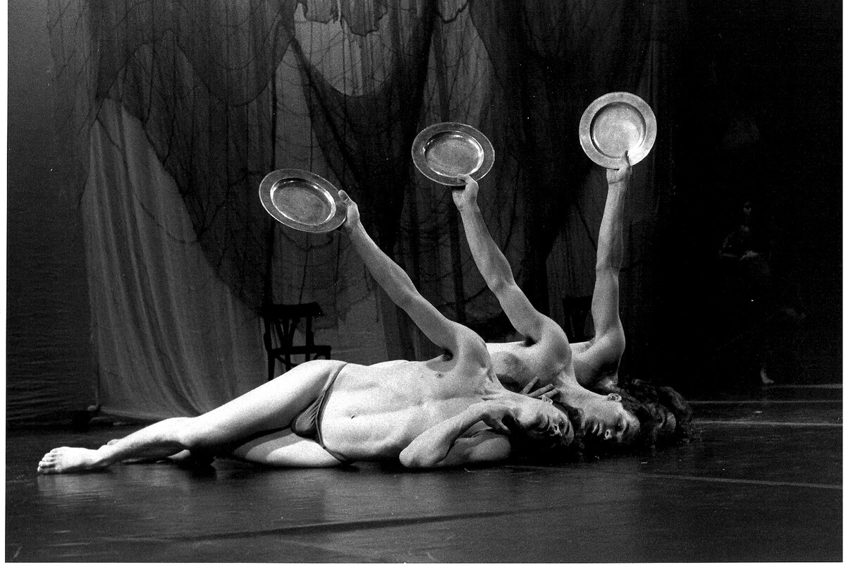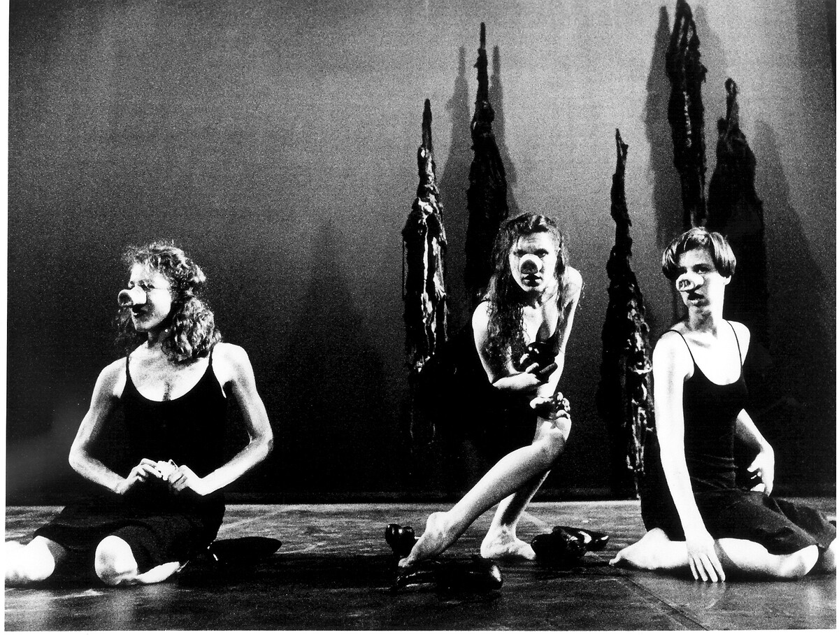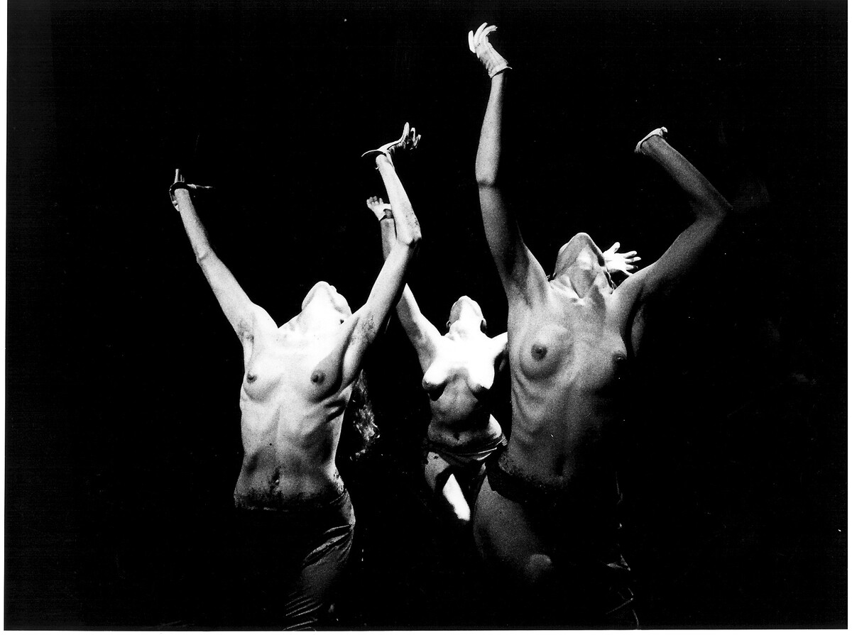 "This finely crafted, discomforting, even brutal dance is a tour de force for seven women in little girl party dresses and seven chairs in cloth shrouds. Its images of blitzkrieg grab hold and won't let go. The women enter one by one, flatfooted, leaden, as if traveling through mist, each with a lit cigarette (a smoking gun? for what crime? war?) dangling from her fingers. They lower themselves, tentatively, into the chairs, their rumps barely touching, as if the seat were too hot. Guttural sounds and snippets of yearning in a Babel of languages explode from their throats. Later, in a passage hot as fission, they fling themselves from the chairs as if rebounding from a gunshot and smash to the ground - they don't so much fall down as fly up and crash-land. They scramble repeatedly atop their seats, again letting fly - in unison, in canon, finally helter-skelter. It's as if they were forbidden to rest."