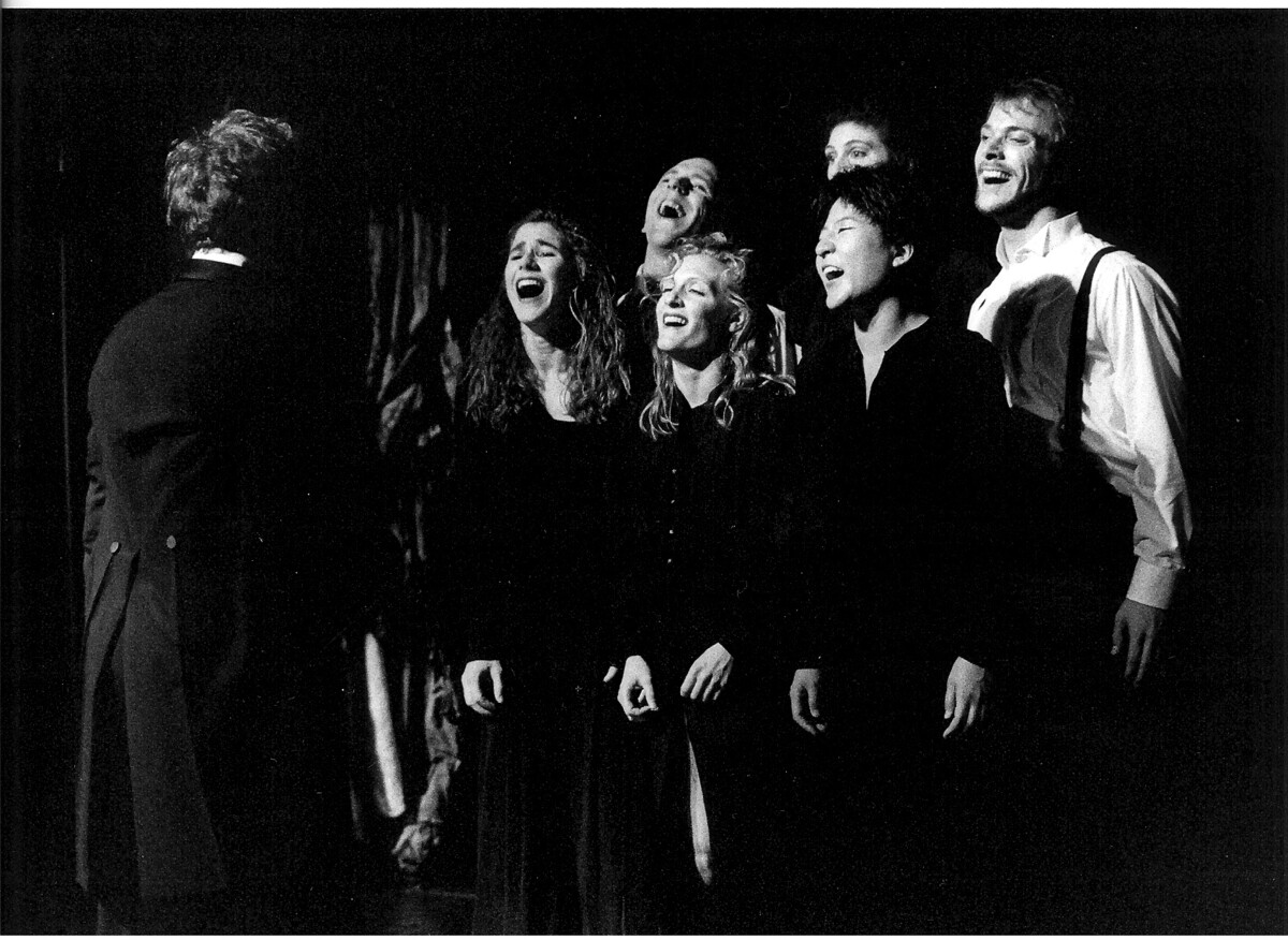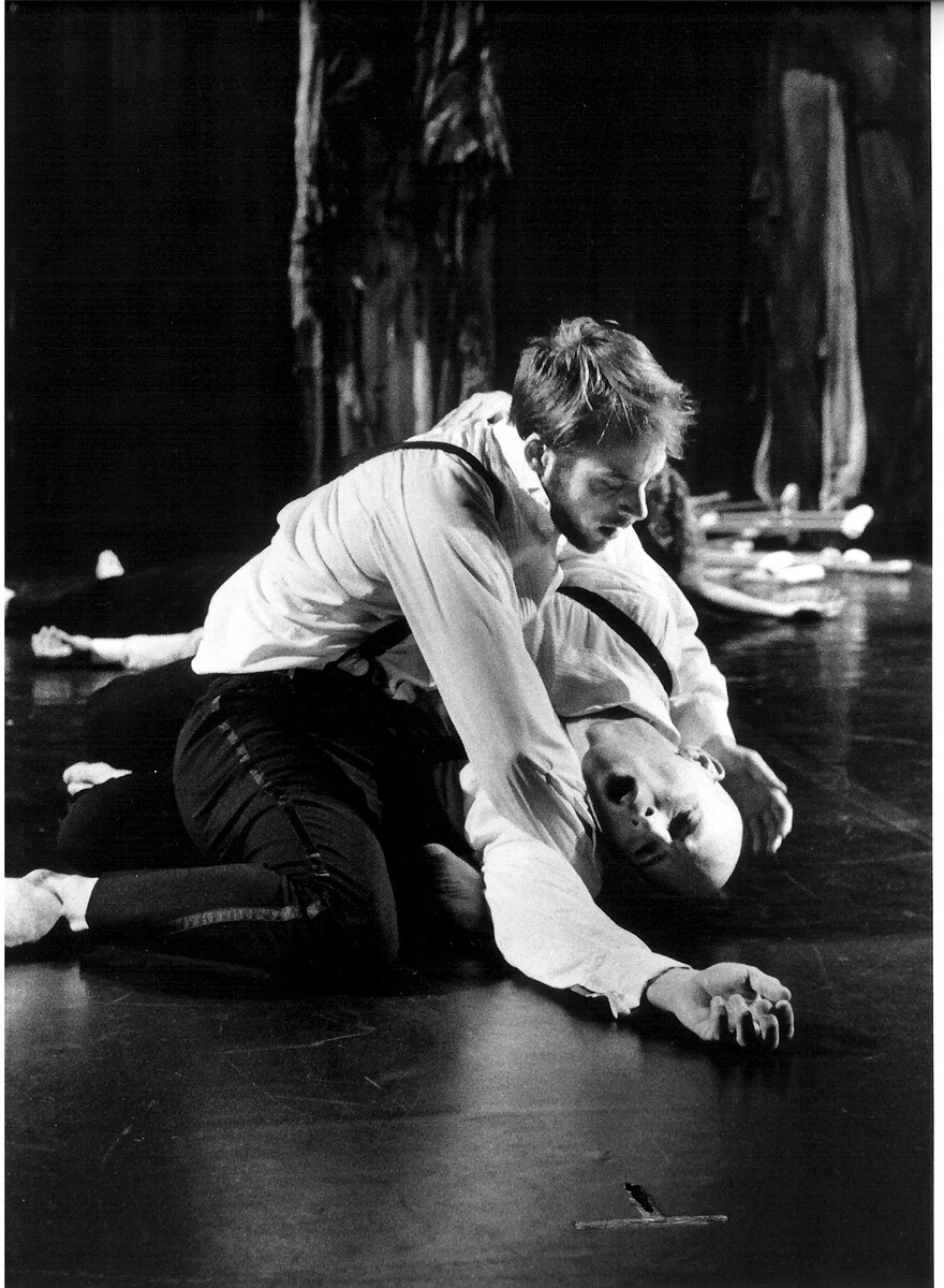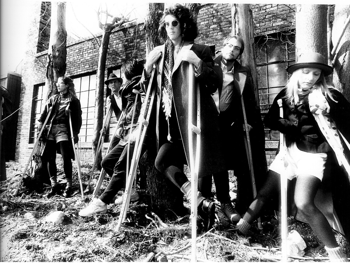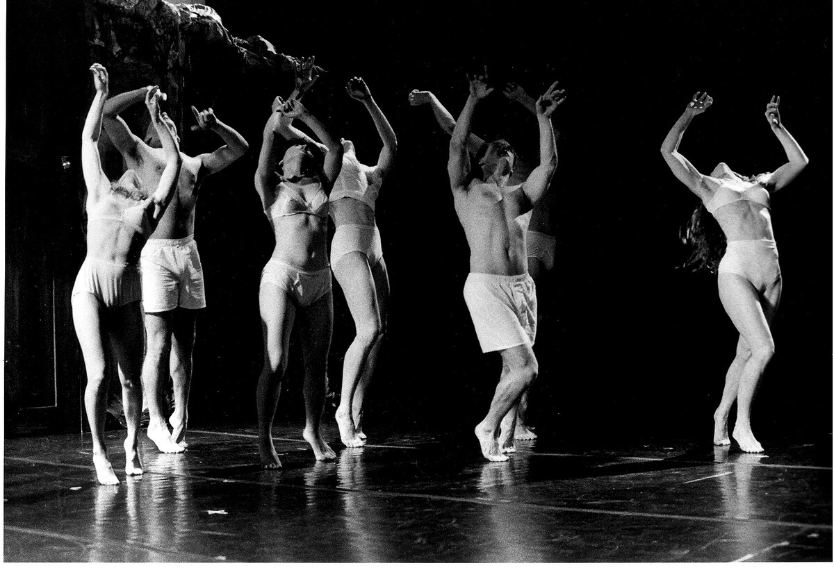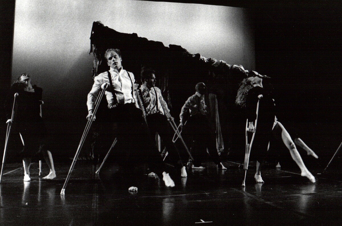 "A regiment of seven dancers lean hard into crutches, then splay them so wide their bodies splat like posts between crossbars. Dangling from the device's armpit pads, the performers hover in split-legged leaps. A black-cloaked choir growl, bark out snippets of words in a Babel of languages, lean right and laugh uproariously, chatter on the phone, sneeze en masse, then cut to silence when their conductors hand slashes the air. Clumped, they follow his every move like prisoners shackled together by ball and chain. Subjects cum icons abound: heads of garlic, a bird cage, a potted plant, men in half slips and girdles, women in tuxedo jackets, a bed covered with clothes.