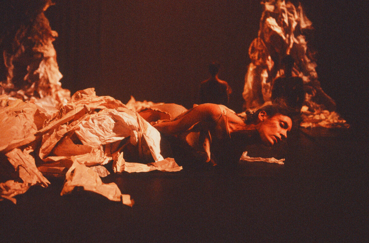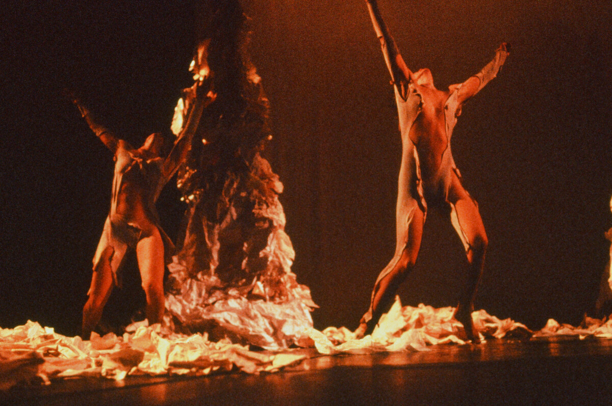 Skin is the first collaboration between composer Pauline Oliveros and choreographer Paula Josa-Jones. It is an innovative performance integrating text, visual design, music, and dance. The set consisted of three twenty-foot long suspended paper trees equipped with microphones, which amplified the sounds of the performers movements. Ms. Oliveros performed the piece's score at the edge of the stage and used instruments including accordion, percussion and voice. Ms. Oliveros and Ms. Josa-Jones developed the concept and performance elements in a residency at Yellow Springs Institute, with dancers Sara Scala Ray and Pamela Newell.